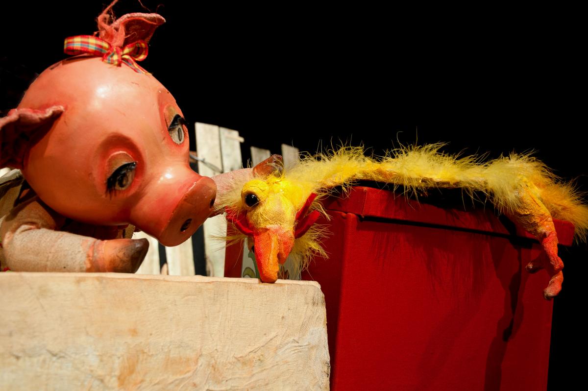 Een sterk visuele voorstelling voor alle fans van varkens en kippen